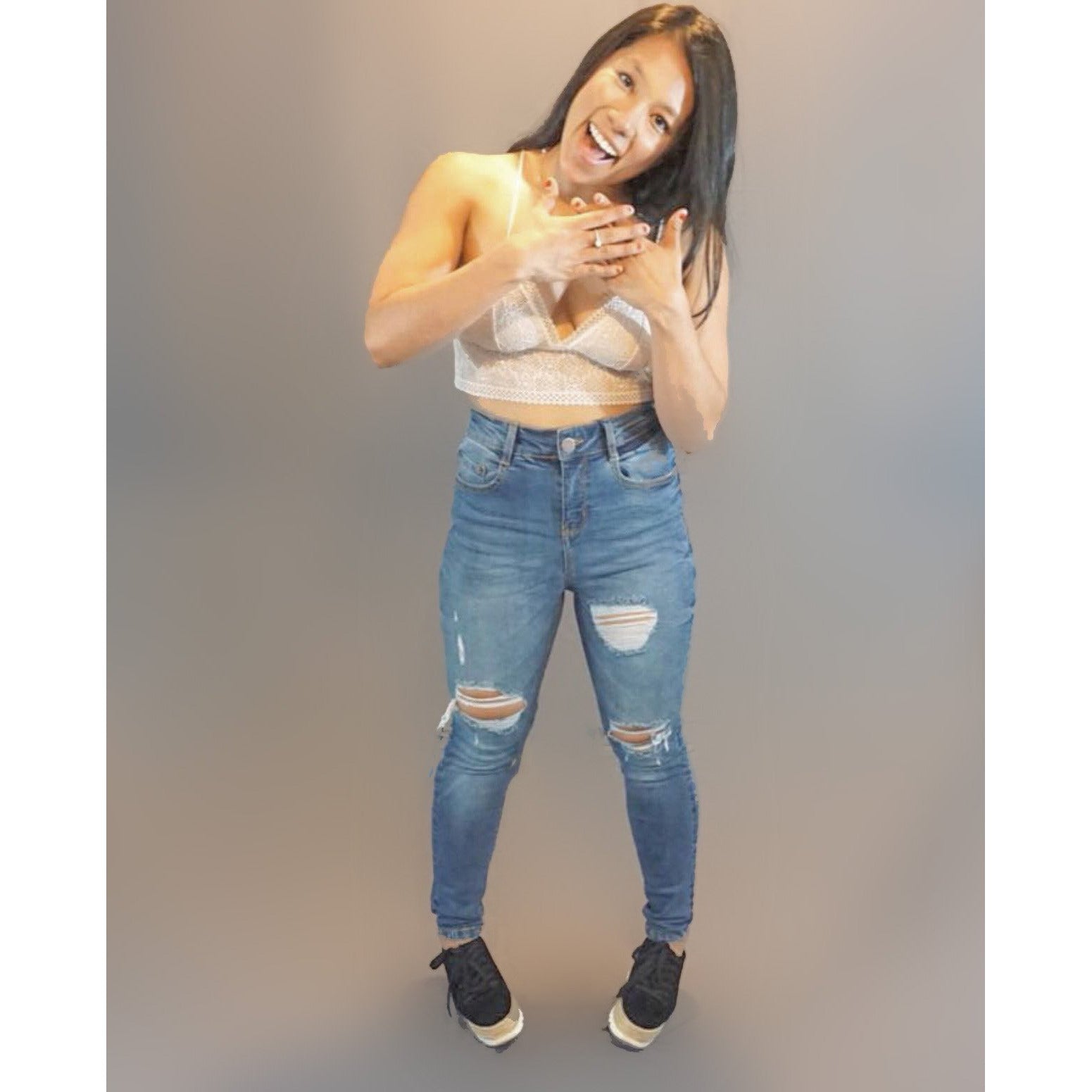 This cute skinny jeans with light destroyed details will go well with everything.